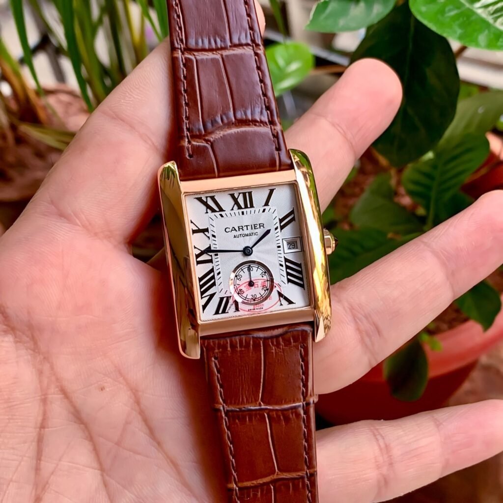 👉🏽 Features: Powered by original Japanese Automatic movement, Stainless-steel Rosegold slim Rectangular case, Anti-reflective sapphire glass on a textured White dial, fastened by a high quality croc Brown leather strap with Original Cartier Lock.